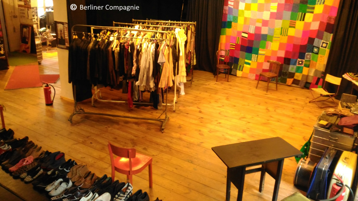 The venue of the Berlin company is located in Kreuzberg in a factory floor of the Quergebäude. Usually, in other productions, the audience sits on the rising platforms. For the Rosa Luxemburg Project, it is the other way around: the play is performed on the pedestals, while the chairs for the audience are on the performance area.